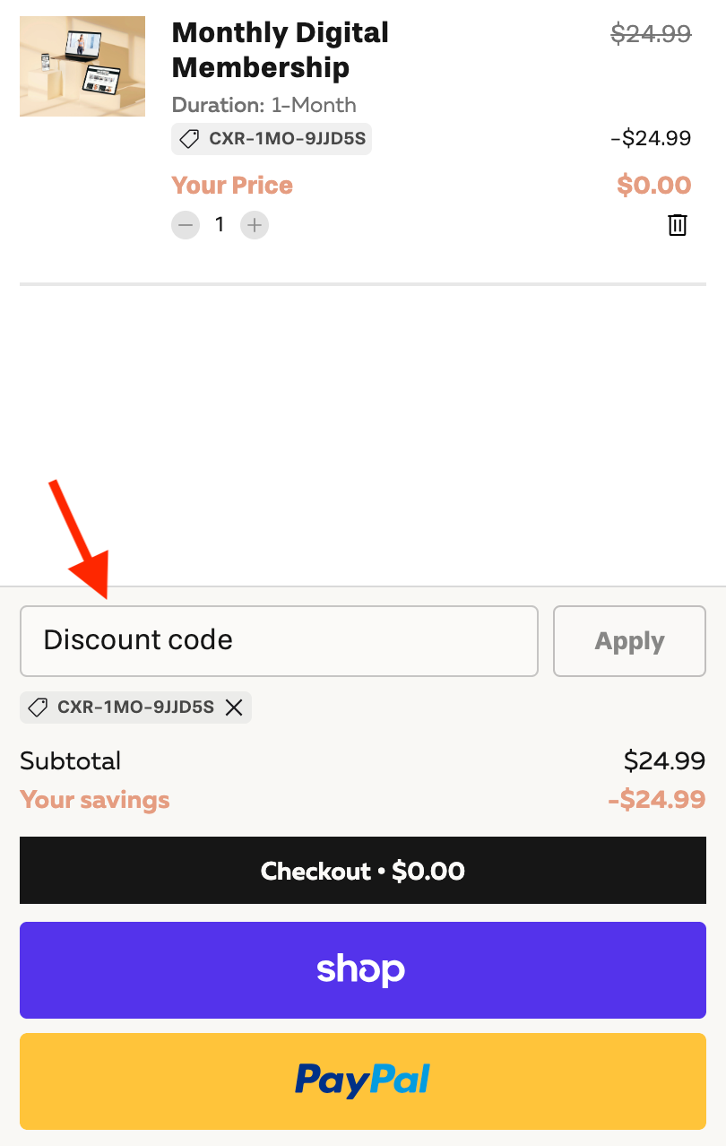 - If the mini cart displays a full price, re-enter the promo code to zero it out.